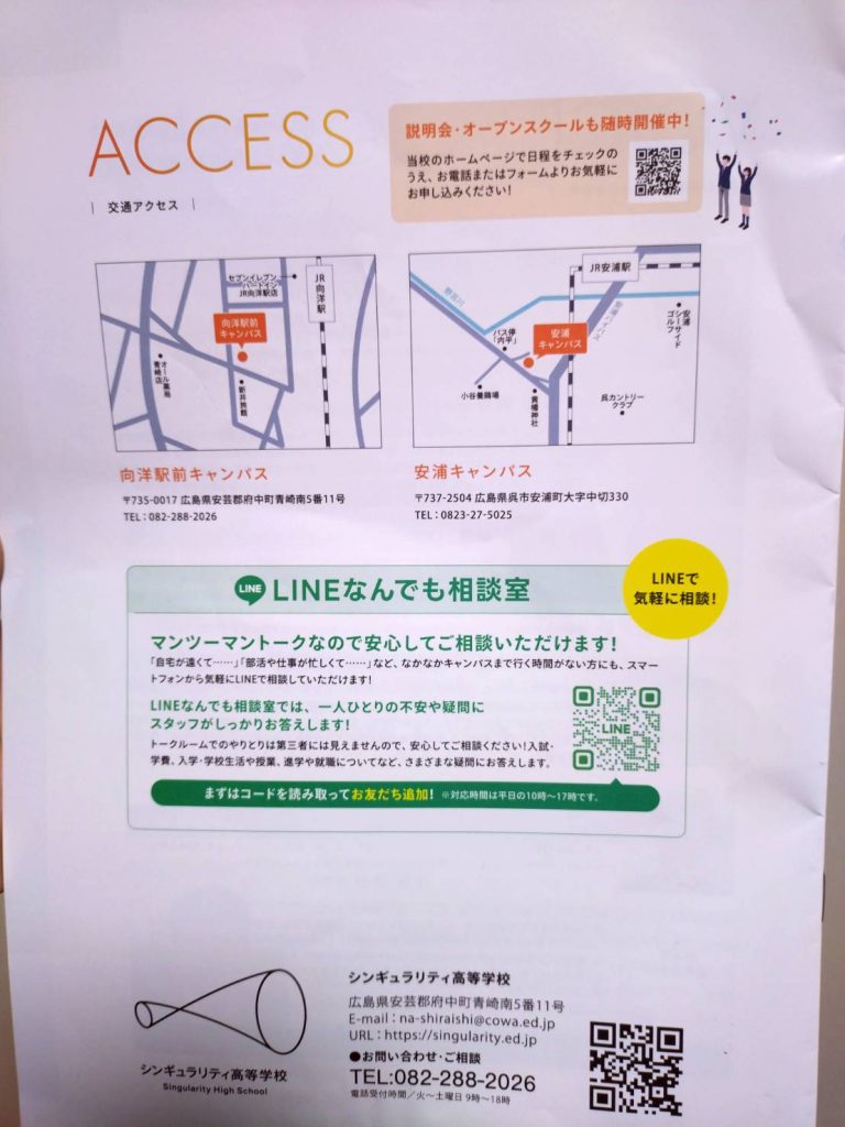 学生さんや保護者の方が「ちょっと相談したいな」と思った時に、すぐに情報にアクセスできるよう、校内にまのぱぺ相談室のパンフレットを置いていただけることになりました。